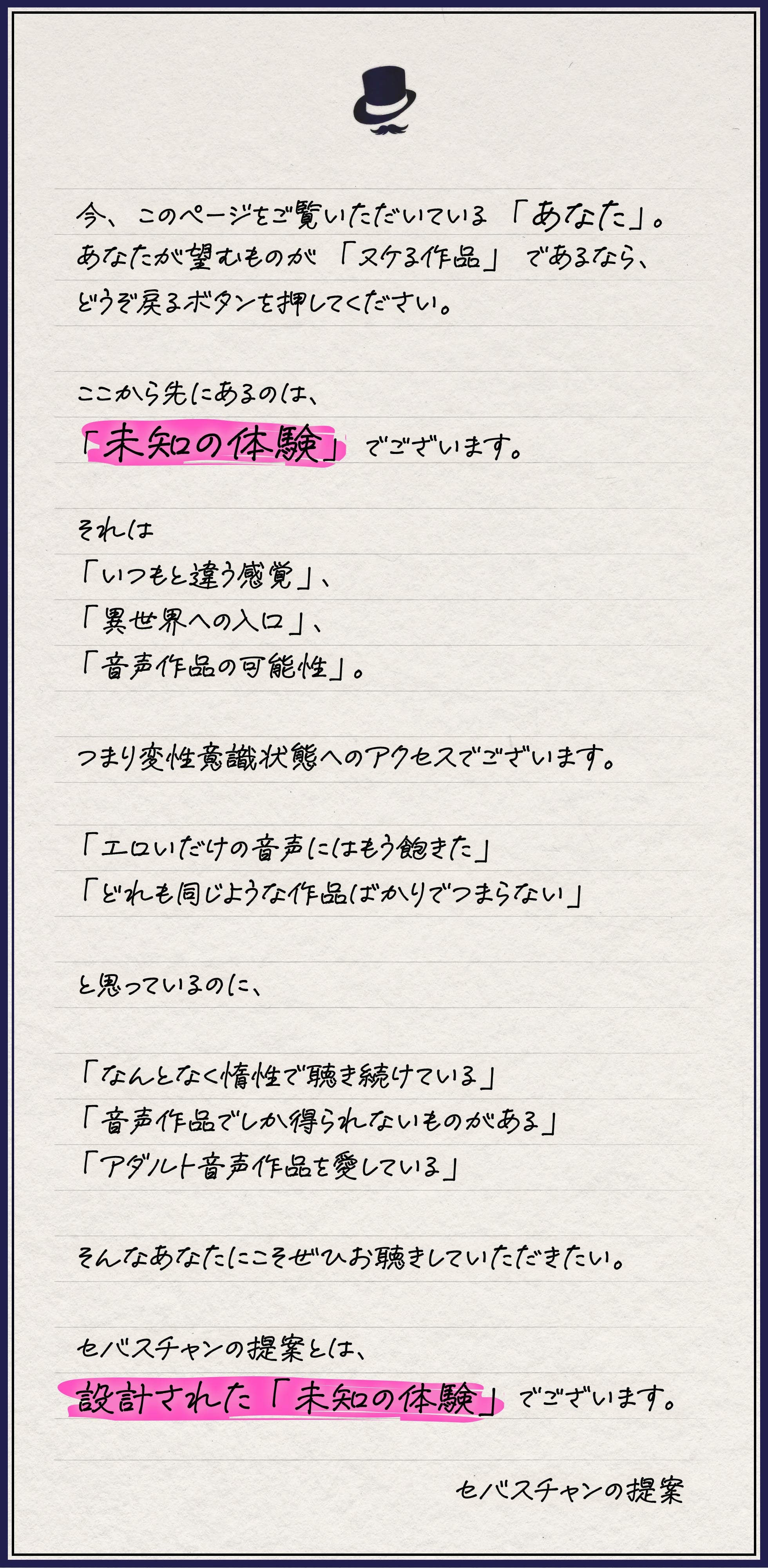 《処女・中出し・ベロチュー》はセバスチャンとリスナーのみなさまとの「約束」です。