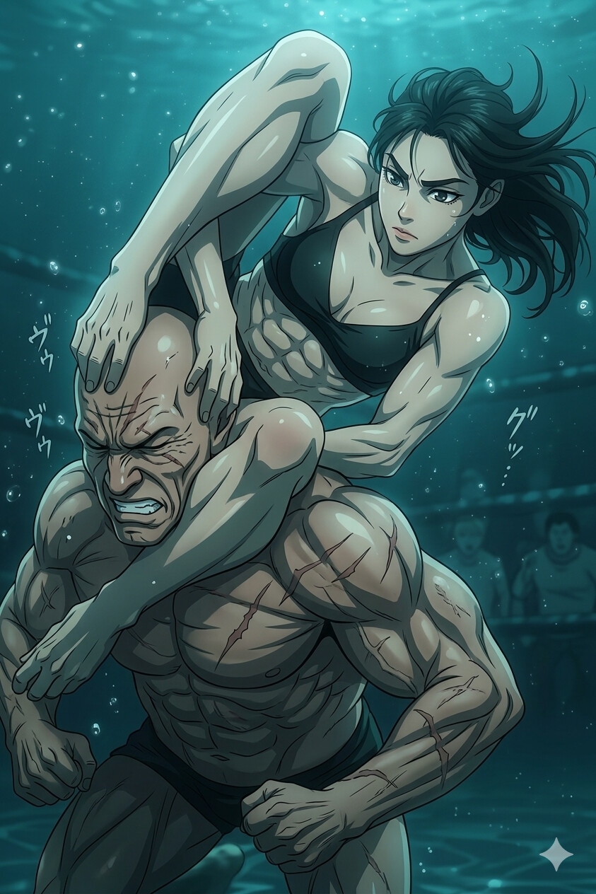 読者を圧倒する、真由美のダイナミックな格闘シーン。105cmのヒップと66cmの太ももが生み出す「ヘッドシザース」や「水中逆ヘッドシザース」の描写は、手に汗握る臨場感!