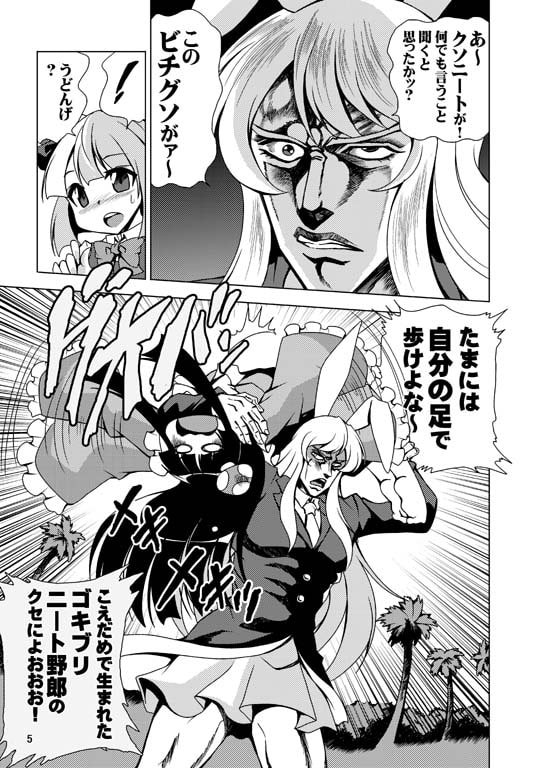 「東方Project」×「ジ○ジョの奇妙な冒険」のダブルパロディ本。いつもと様子の違ううどんげが輝夜に襲いかかる!? 新キャラ、「皇帝」の魔理沙、(ちぇん)C・ガイルも初登場する見所満載の1冊。