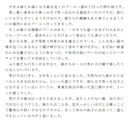 子持ちの女性と、○学2年生の男の子がレジャープールで出会い、