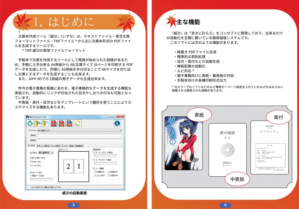 文庫本作成ツール『威沙』は当サークルが手製本による自作小説作品の公開のために開発・メンテナンスを行っている文庫本作成ツールです。