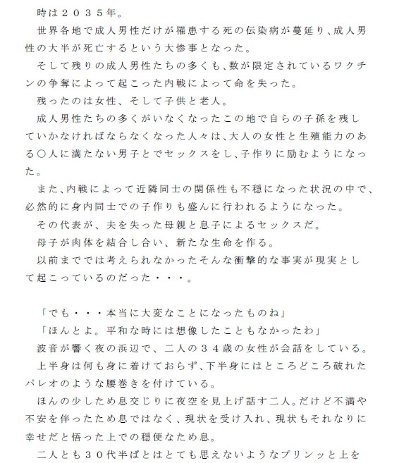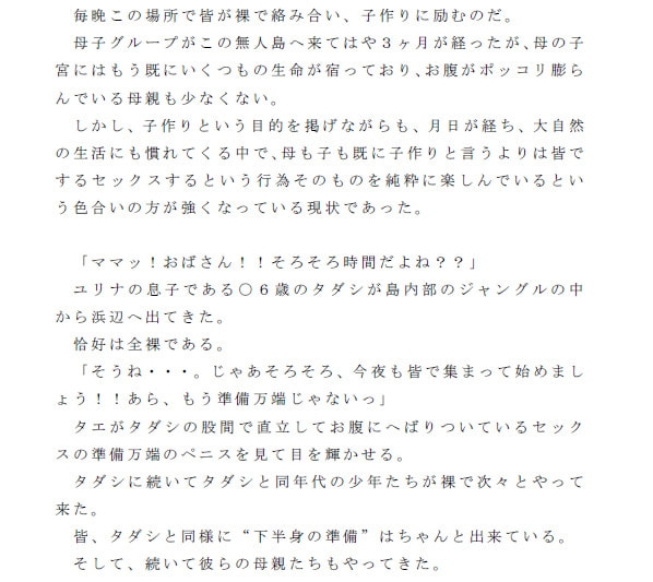 病と内戦から避難するため、そして同時に子作りに励むために無人島へやって来た母子グループの乱交を書きました。