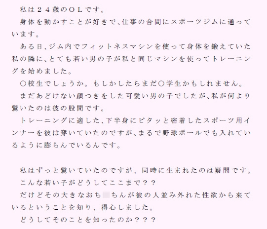 スポーツジムで身体を鍛える主人公のOLが、そこで出会った巨根の少年とセックスする話。