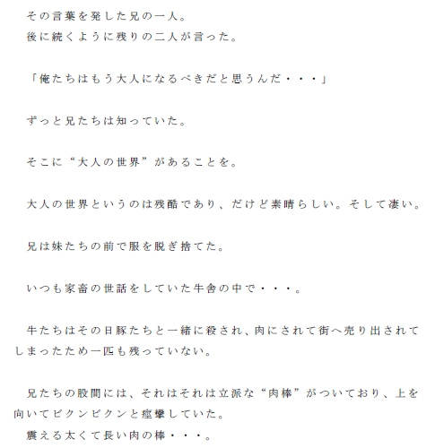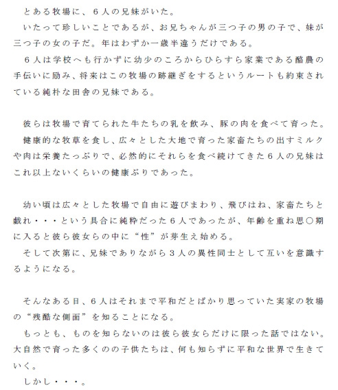 大自然の牧場で育ち、家畜たちと戯れて育った三つ子の兄と三つ子の妹、計6人の兄妹。
