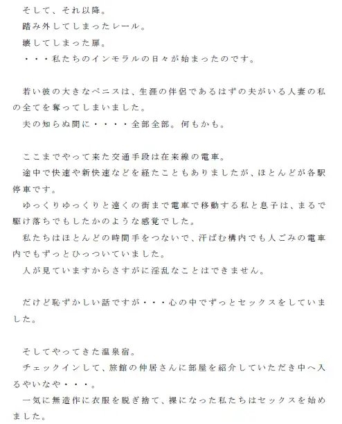 日常からの秘密の逃避行。罪深い母と息子の母子相姦小説!!