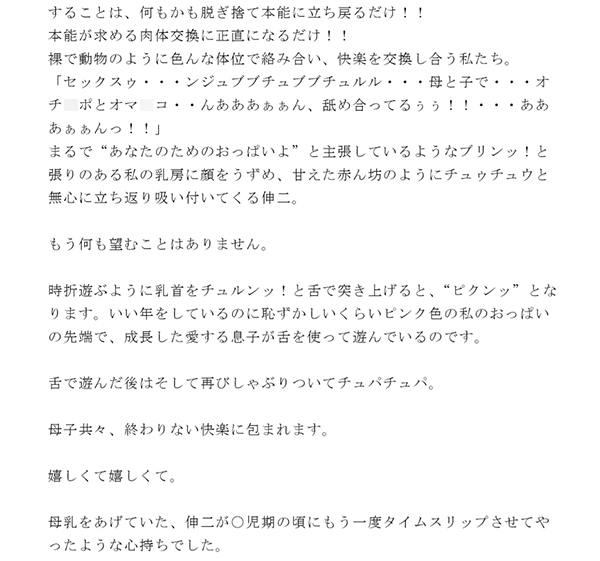時折遊ぶように乳首をチュルンッ!と舌で突き上げると、“ピクンッ”となります。いい年をしているのに恥ずかしいくらいピンク色の私のおっぱいの先端で、成長した愛する息子が舌を使って遊んでいるのです。