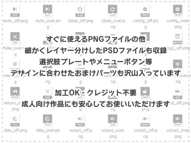 選択肢プレートやメニューボタンなど、デザインに合わせたおまけパーツも沢山入っています。