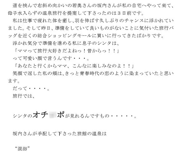 主人公の人妻が近所の若奥さんに誘われ、互いの息子を連れて温泉旅行へ行くことに決まった。