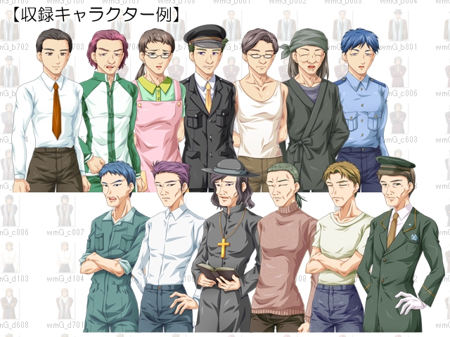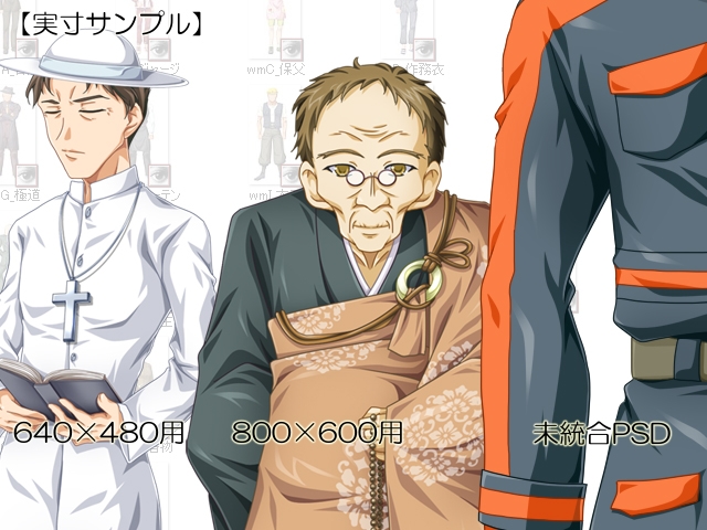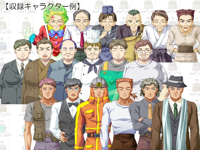 ●職種:会社員(背広)、スポーツ選手(ジャージ)、保父、作務衣、警察官(警備員)、