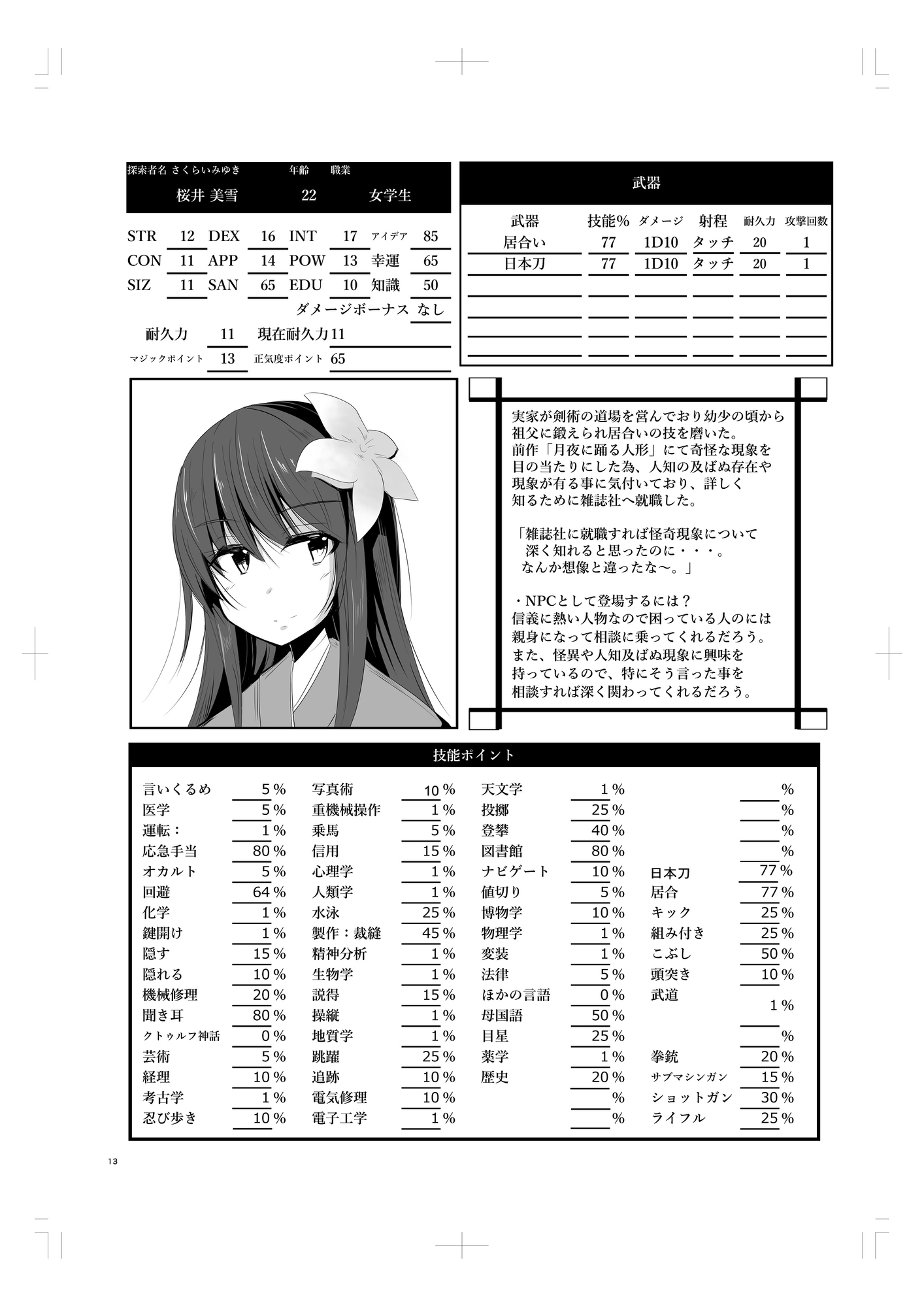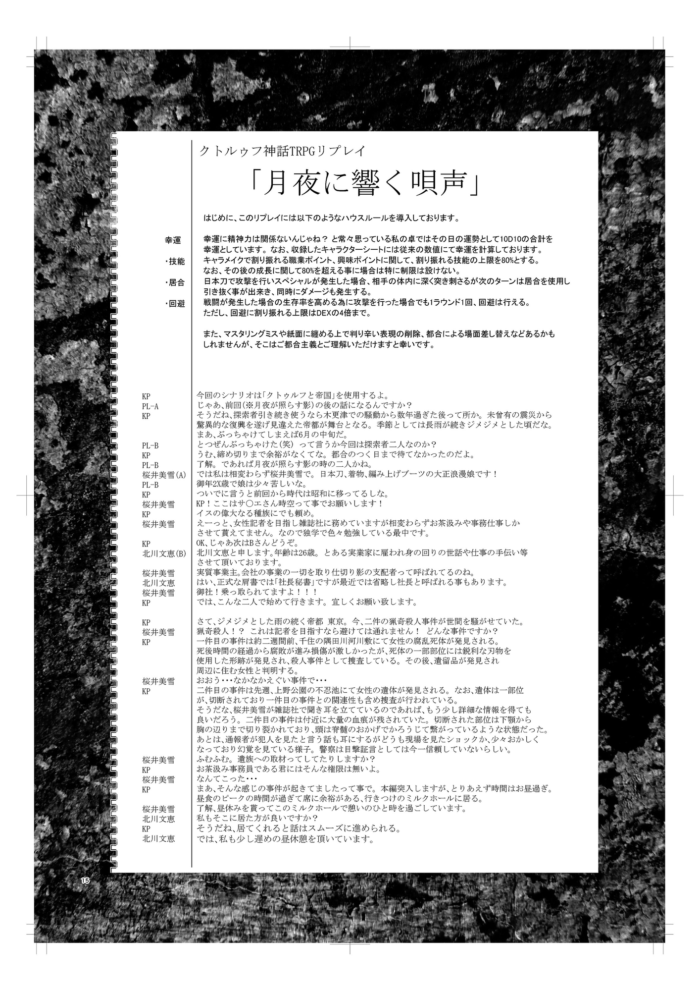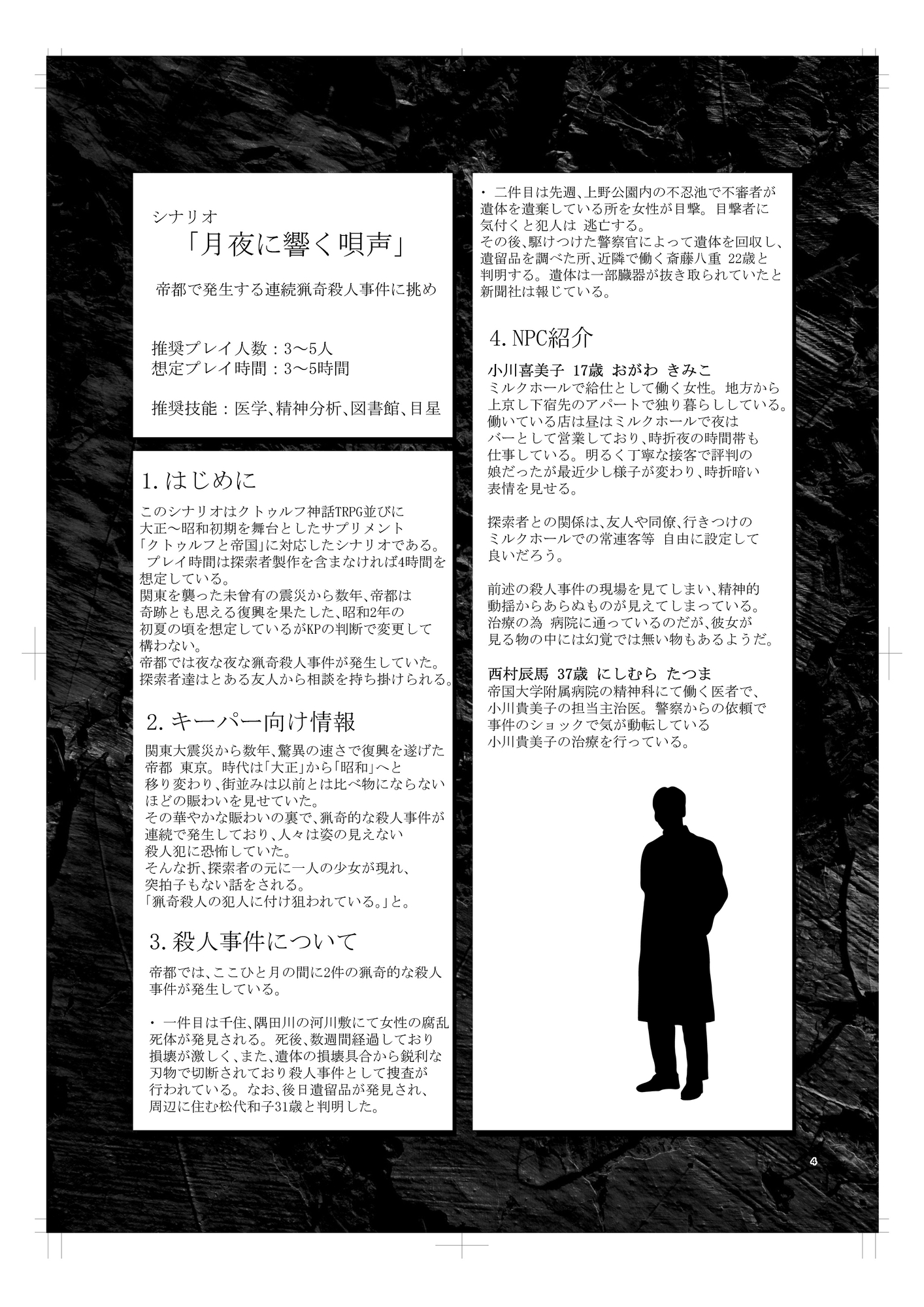 帝都で発生する猟奇殺人事件。 探索者はその事件に遭遇したと言う少女に出合う。