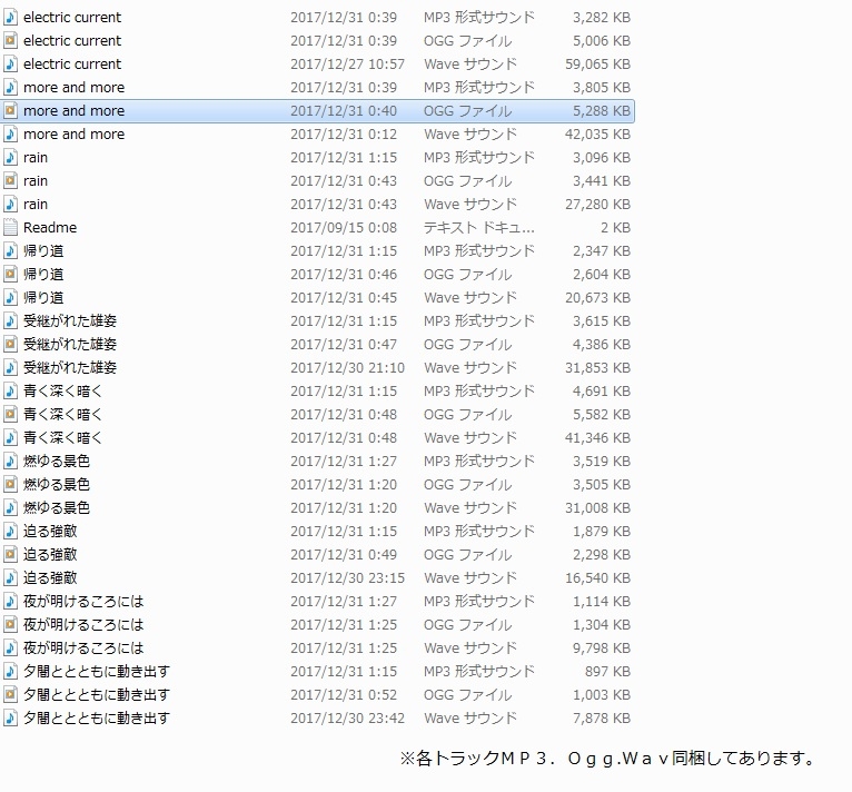 イントロ、エンディングがある2曲以外全曲ループ再生で違和感なく流れ続けるようにしていますので、手間無くループ再生させる事が出来ます。