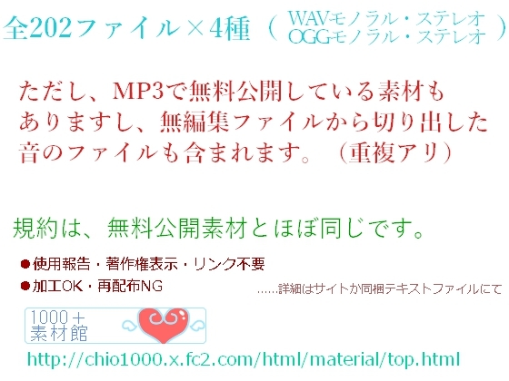 本作品は、無料公開していた効果音の、なるべく収録されたままの音や、もう少し使いやすいように加工された音が入っています。