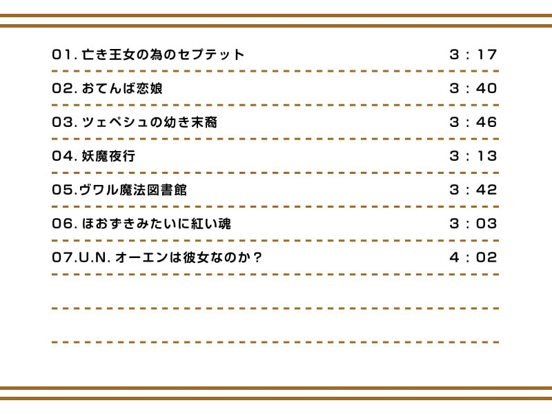 90年代の携帯ゲーム機を楽しんだ世代に贈る、インスト音楽集。「東方紅魔郷」をポップなタッチにアレンジした全7曲/約24分。