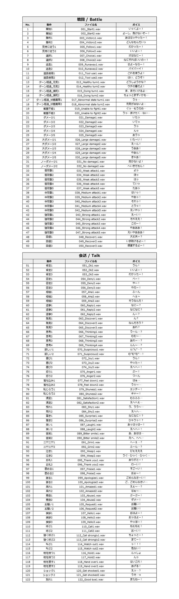 ・戦闘ボイス 全50ボイス(攻撃・ダメージ・回復など)