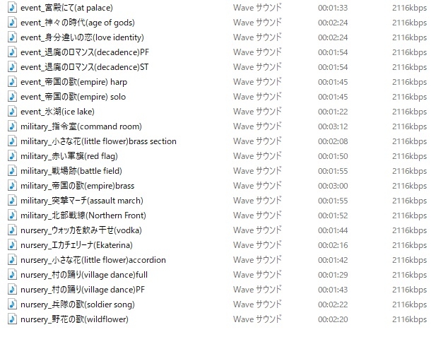 アレンジ違いを含む全22ファイル、独特の雰囲気を是非ゲームのワンシーンに加えて下さい。