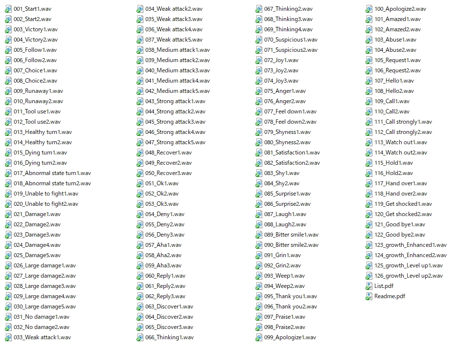 日本のRPG、ACT、ADV、STGなどのゲームでの使用を想定しており、戦闘中の掛け声やダメージ声、日常会話、喜怒哀楽などの1フレーズの汎用的なエモーションボイスが収録されています。