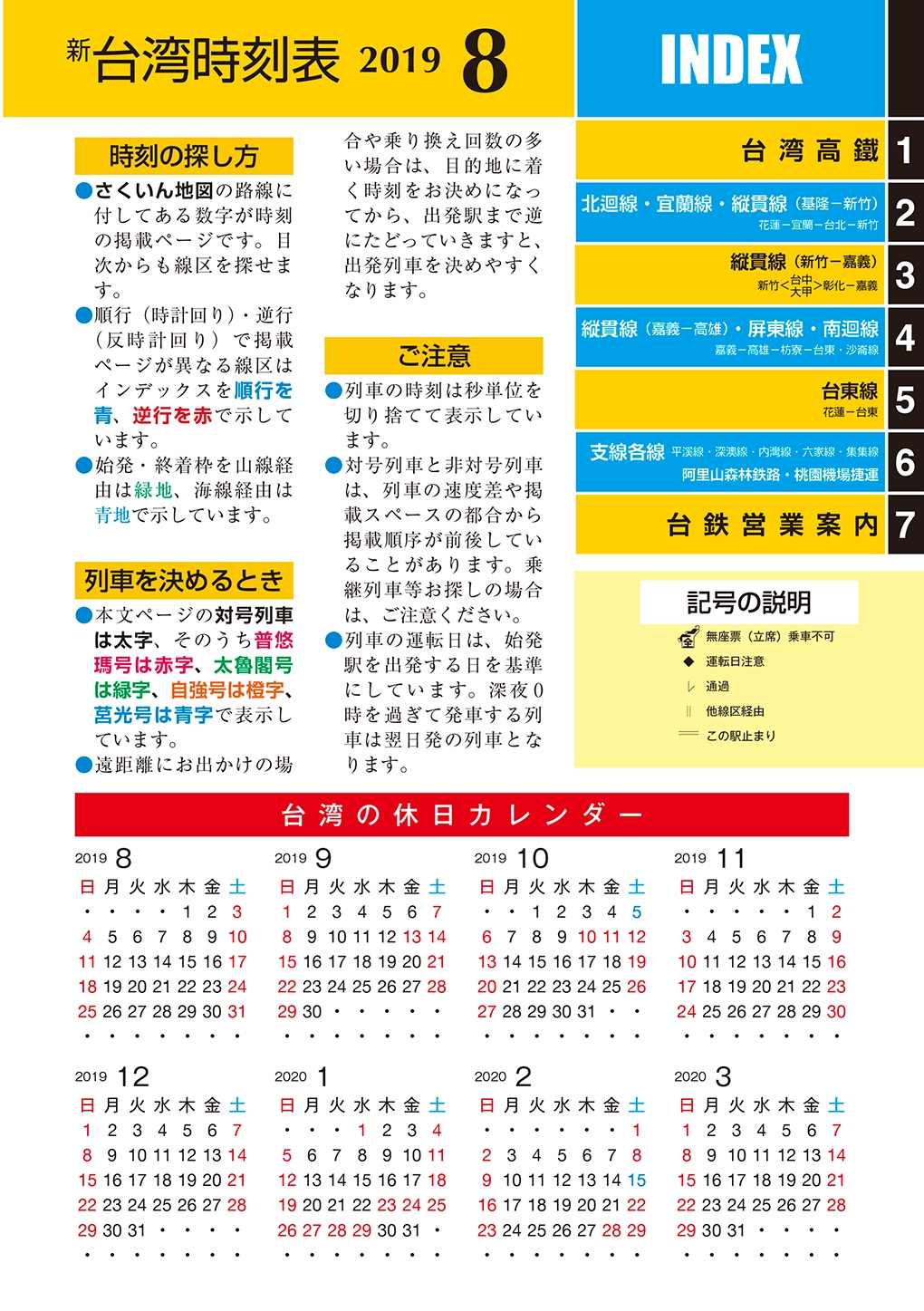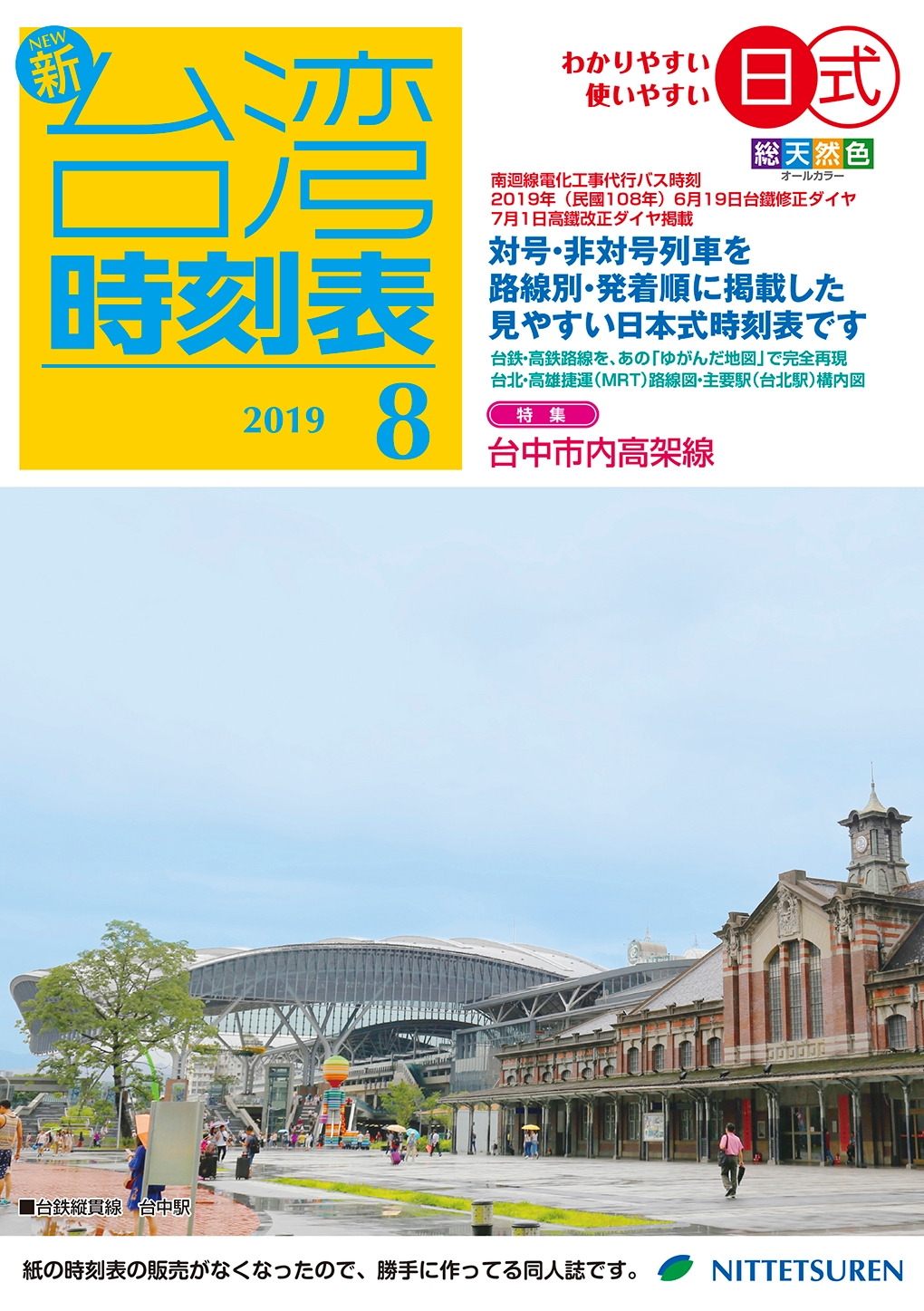 この「日式台湾時刻表」は2019年7月1日現在の台湾鉄路管理局および台湾高速鉄道から発表されているダイヤの情報をもとに作成されたもので2019年6月19日の台鐵ダイヤ修正、同7月1日の高鐵ダイヤ改正に対応しています。素人が自分で使うために編集したものであり、ある程度の注意をもって編集していますが、細かな点で編集上のミスや元々のデータの誤りや細かなダイヤ修正などがあるものと思われます。実際に旅行される際は各社のウェブサイトなどで再度ご確認の上ご利用ください。