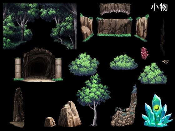 ダンジョンコア、崖崩れ、岩の大小、亀裂、橋、鉱石、斜面の茂み(奥、中間、手前、正面)、森、段差(左右、正面)、洞窟の入口(左右と奥の左右、正面)、茂み3種、木1種
