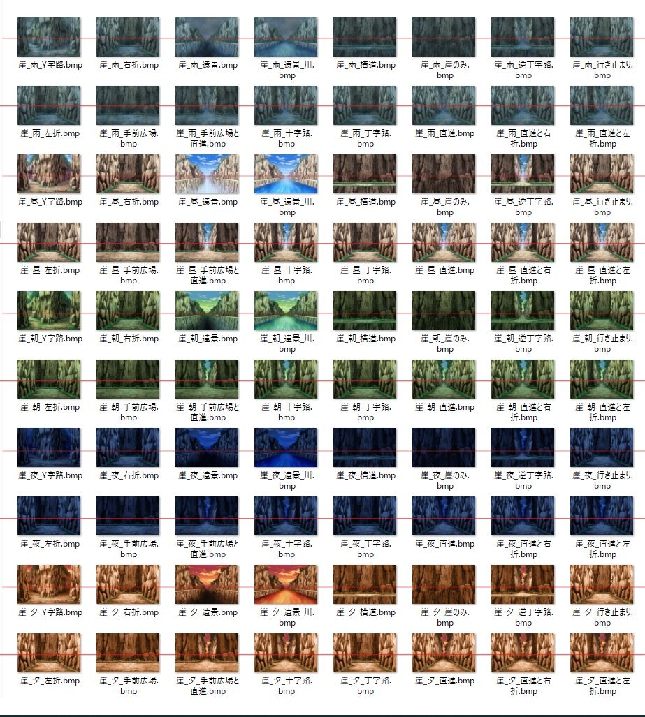 今までのものに加えて、逆丁字路、広場、広場と直進、横道、崖のみ、遠景、遠景と川の7種類の計16種類です。