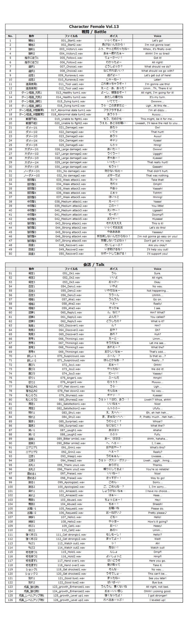 ・戦闘ボイス 全50ボイス(攻撃・ダメージ・回復など)