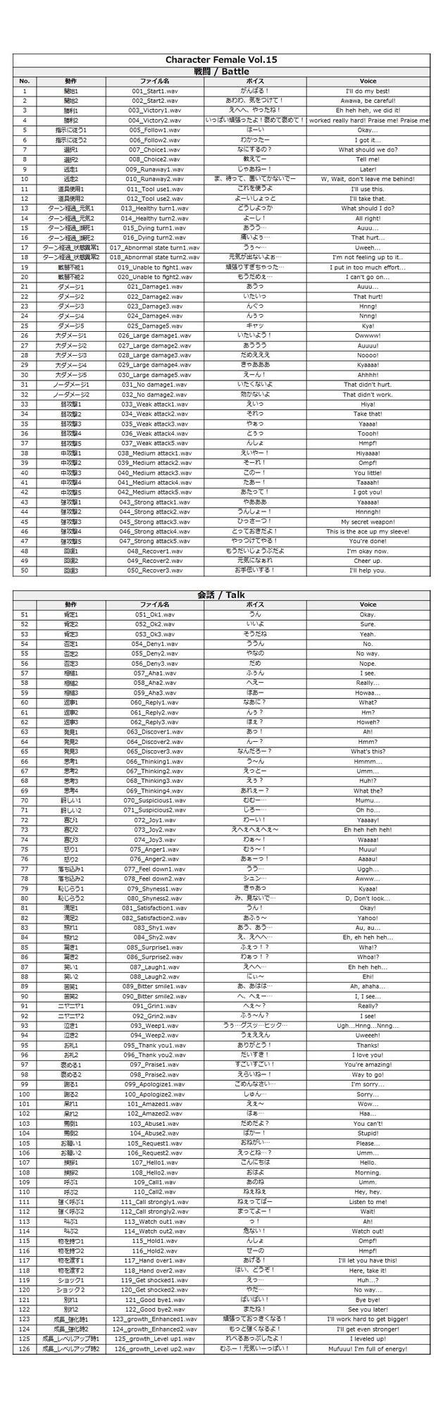 ・戦闘ボイス 全50ボイス(攻撃・ダメージ・回復など)