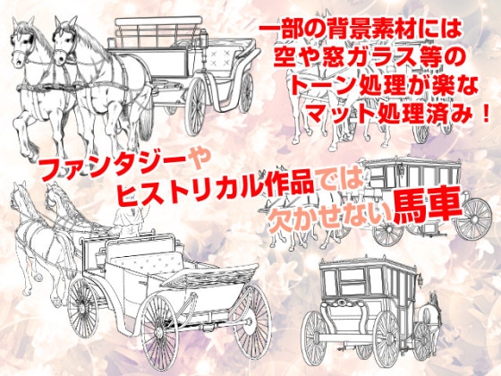 ファンタジー・ヒストリカル・西洋などのジャンルの世界を醸し出す、古城・教会・馬車などを集めた背景素材集です。