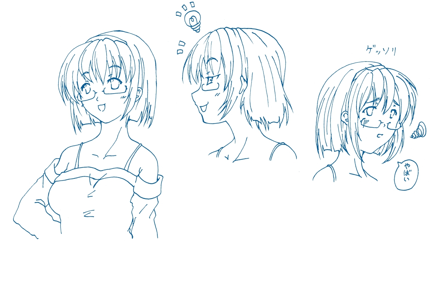 線画、単色塗り、カラー、カラー仕上げと段階を追った画像集です。