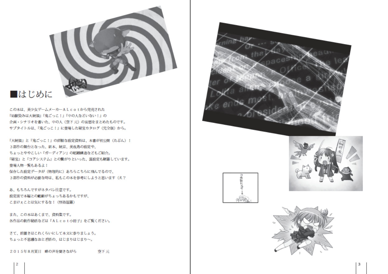 企画・シナリオを書いた『空下 元』自ら編集した『幼馴染みは大統領』『鬼ごっこ!』『中の人などいない!』の設定資料集。