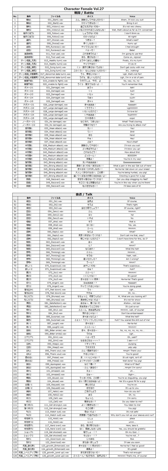・戦闘ボイス 全50ボイス(攻撃・ダメージ・回復など)