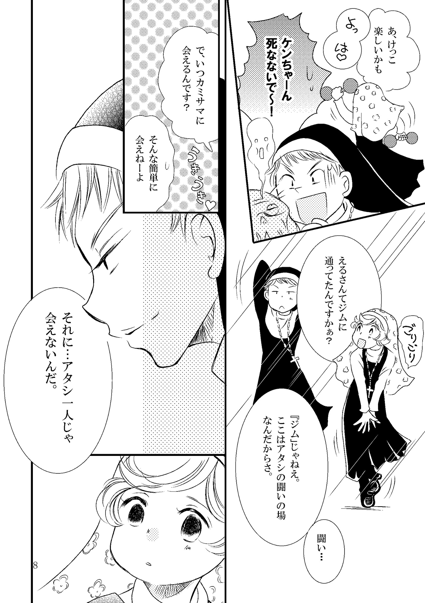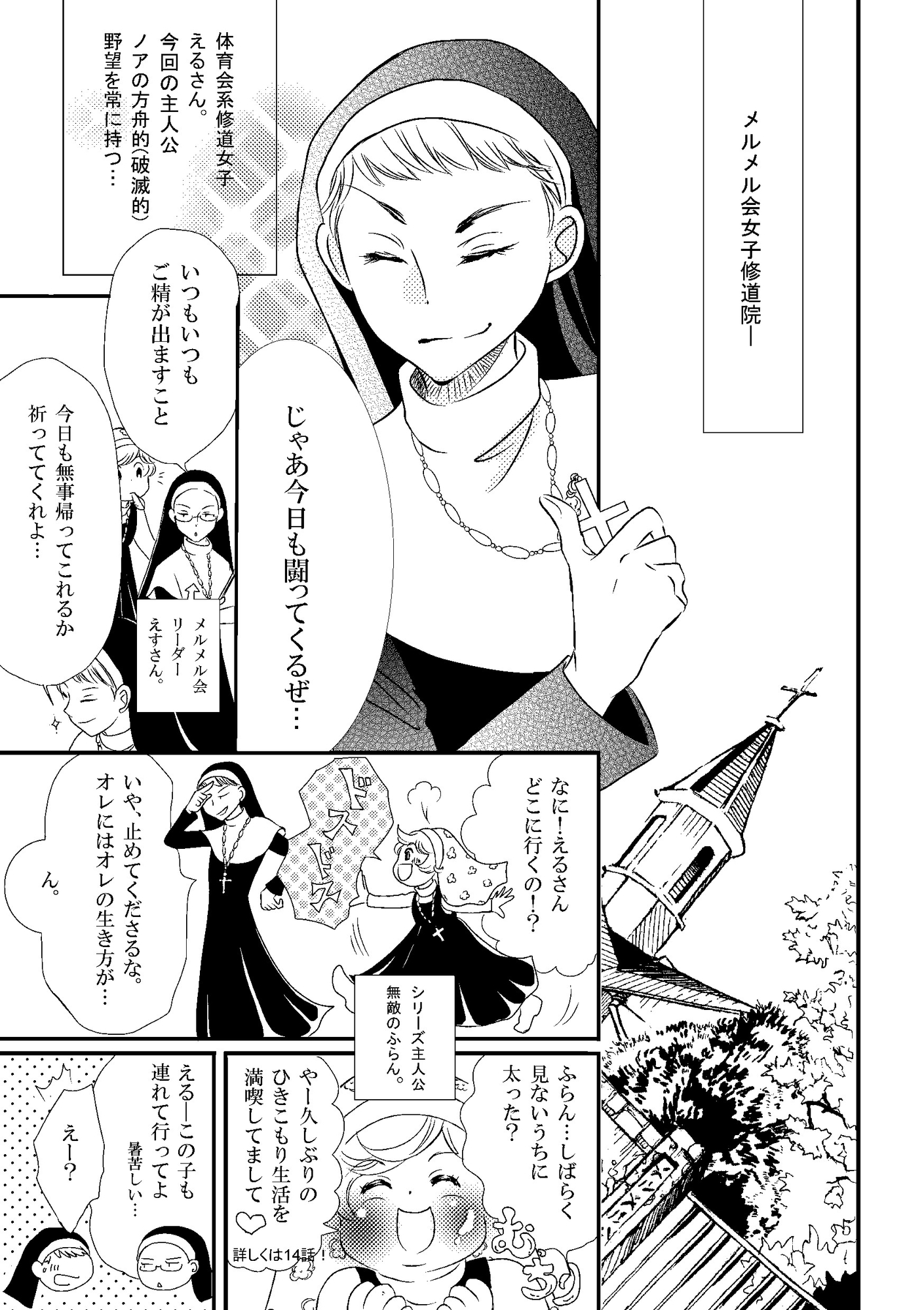 今回は体育会系のえるさんが主人公。長いひきこもり生活で太った修道女たちは、えるさんに連れられて市民ジムでポンコツトレーニング開始。