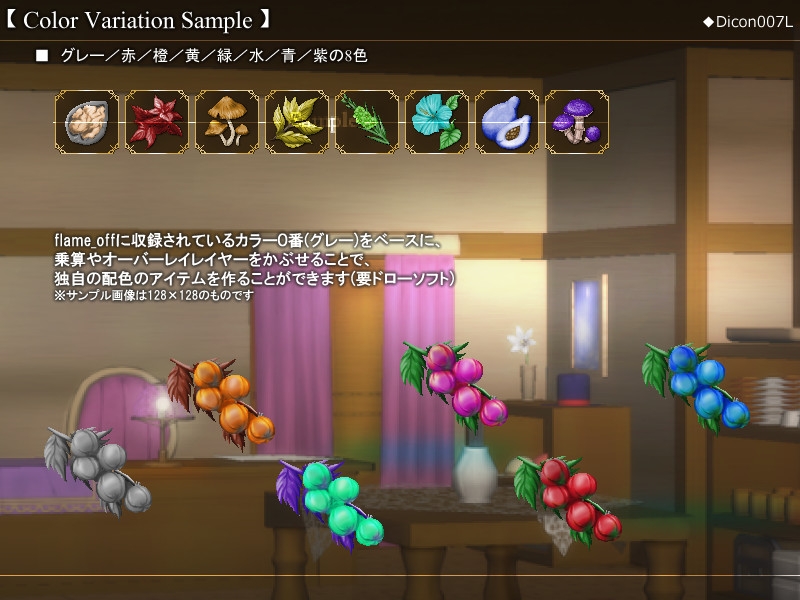 種、木の実、葉、花、果実etc 40種×8色 320種収録したアイテムアイコン素材集の大サイズ版です