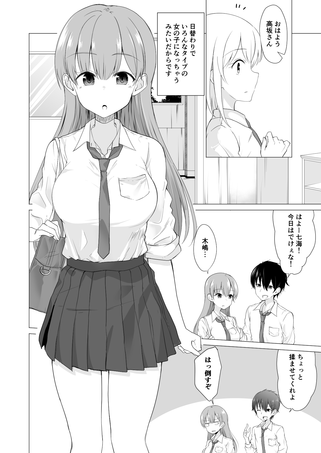 ほぼ毎日違う女の子になっちゃう男の子、七海凪と転校生の女の子高坂帆波のほのぼのTS百合コメディとなっています!