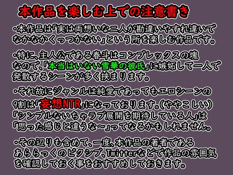 実は両想いという設定の二人ですが、内容的には「雪華」の幼馴染「春斗」の妄想(「イケメン彼氏」と「自分の好きな子=雪華」がいちゃいちゃしていると所)が多いため、ジャンル的には「妄想NTR」という事になります。