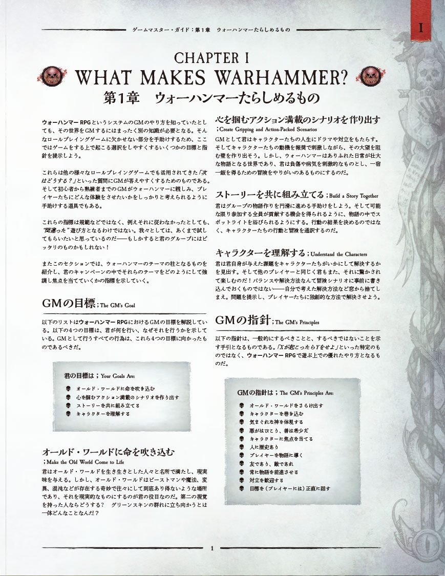 『ゲームマスター・ガイド』は、セッションを円滑に進めるためのアドバイスが記載されている他、プレイヤーにも役立つキャラクター向けの動機の一覧の他、キャラクター同士の出会いや、死の運命の予言である《運命付け》の内容をランダムに決定する諸表が掲載されている。