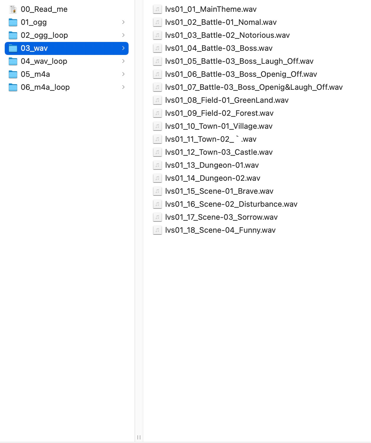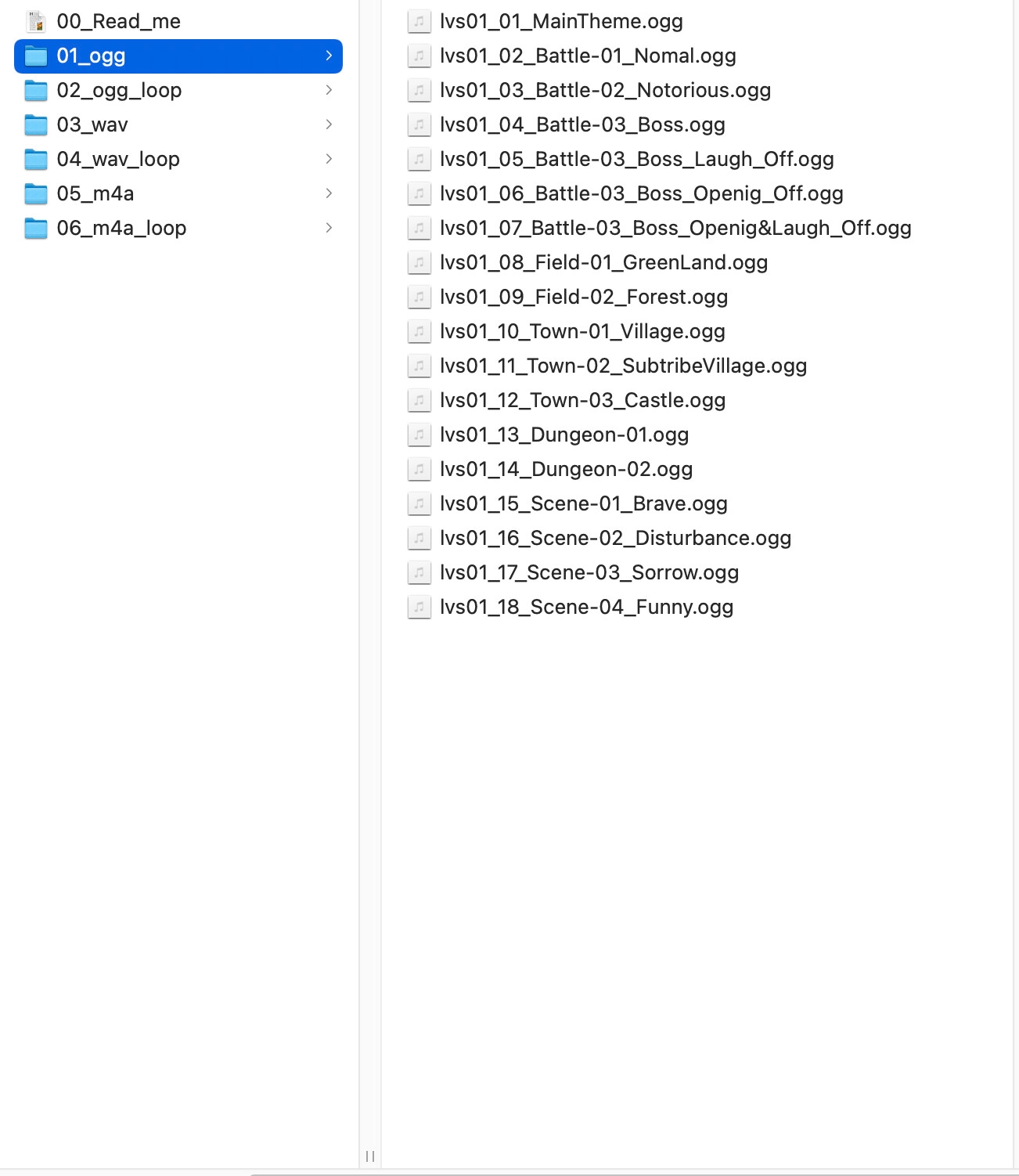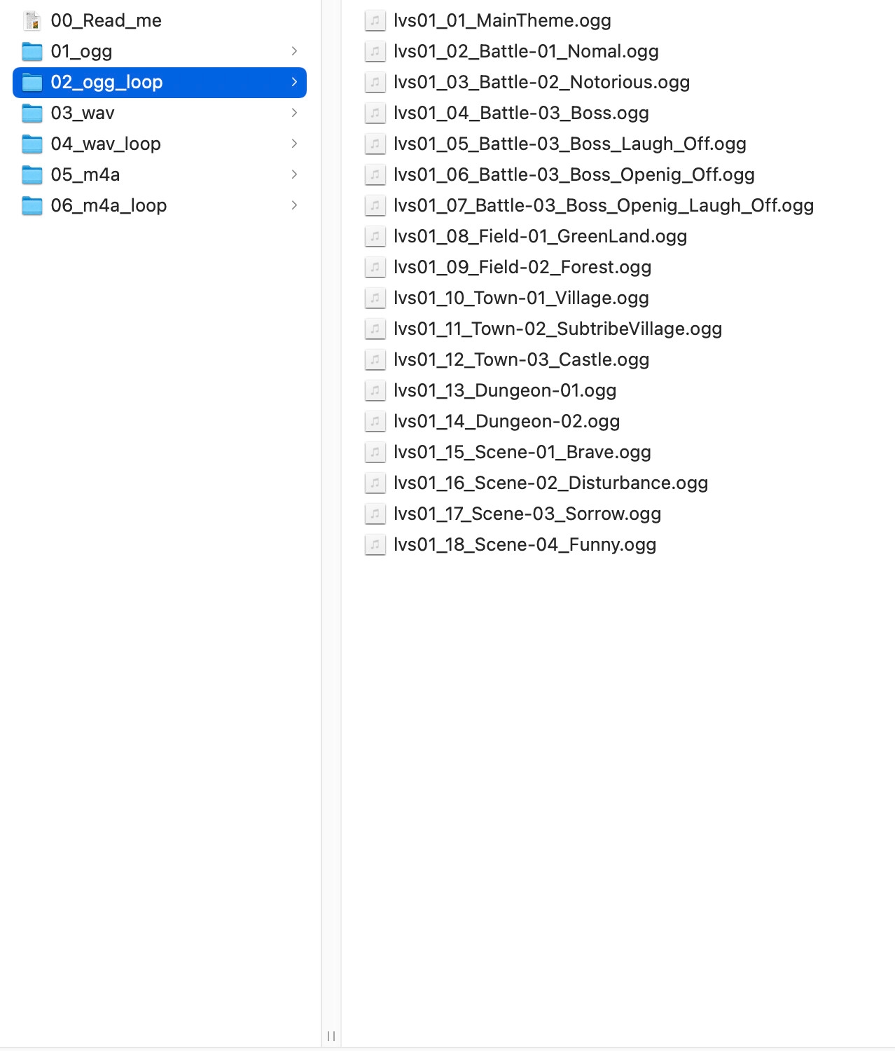 ・wav、ogg、m4a、各ループタグ有り、ループタグ無しの合計6種類の形式が収録されています。