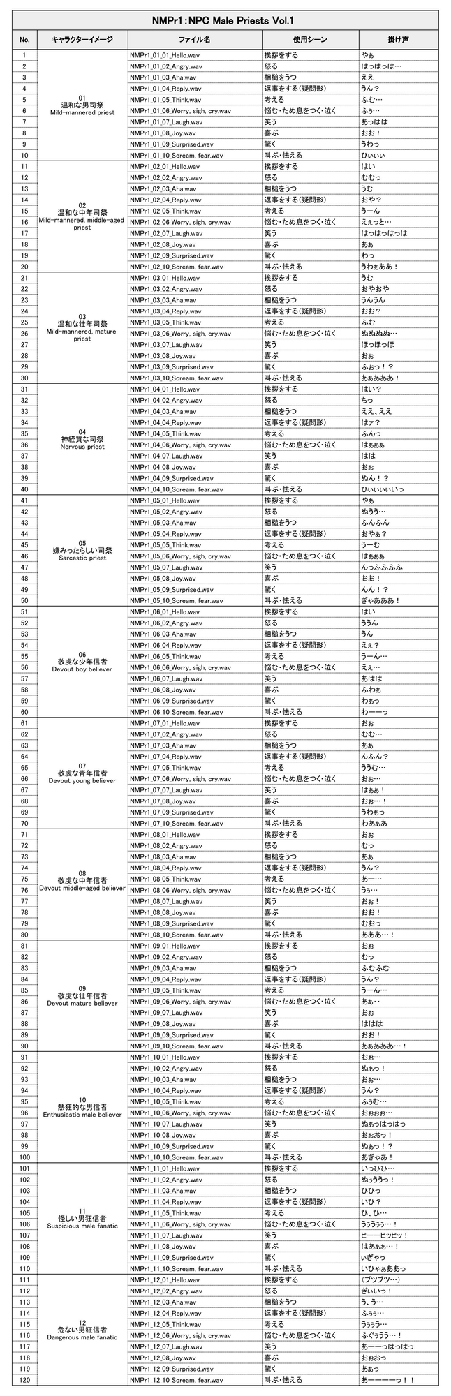 ファンタジー世界の男性聖職者・信者をイメージした12キャラクターのNPCボイスシリーズです!