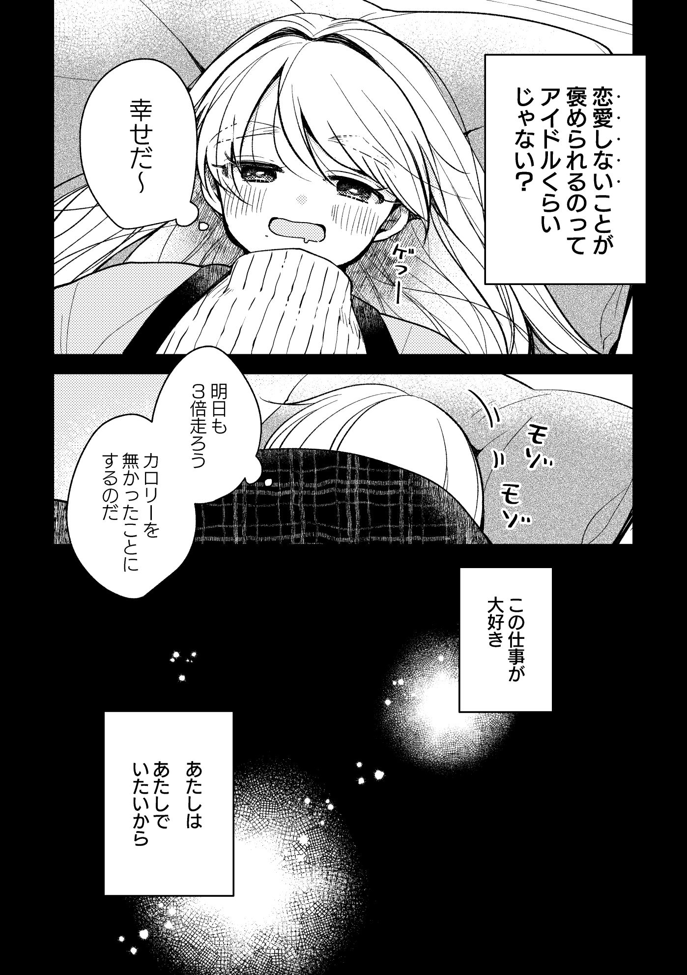 アイドルの恋愛が忌避されていたのは過去の話。恋人のために歌うアイドルが人気を攫い、いつしか「恋人が居ること」が人気アイドルになるには必要な条件になっていた。WEBで公開した話+おまけ漫画です!