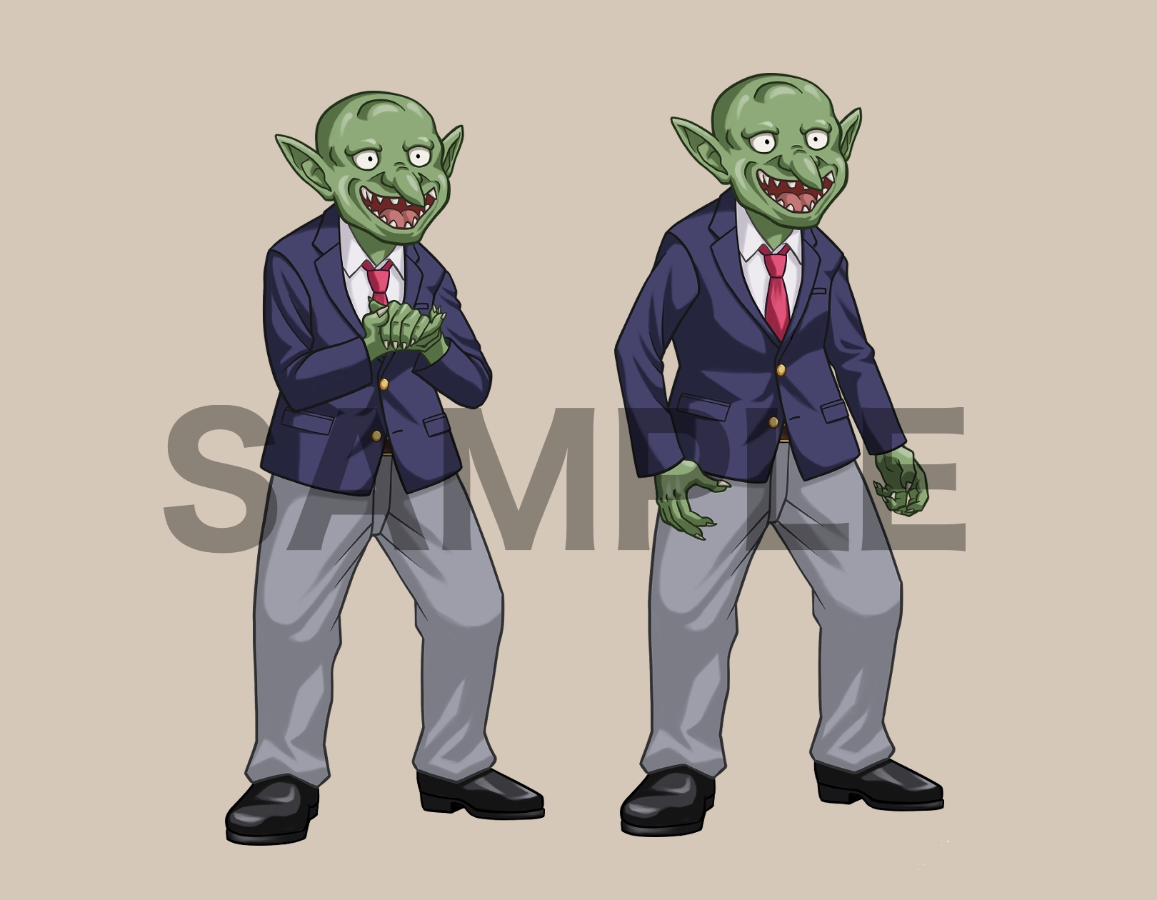ゲームや動画などで使える立ち絵素材、ごますりゴブリン、現代スーツ、ファンタジー服、学生ブレザー、C09