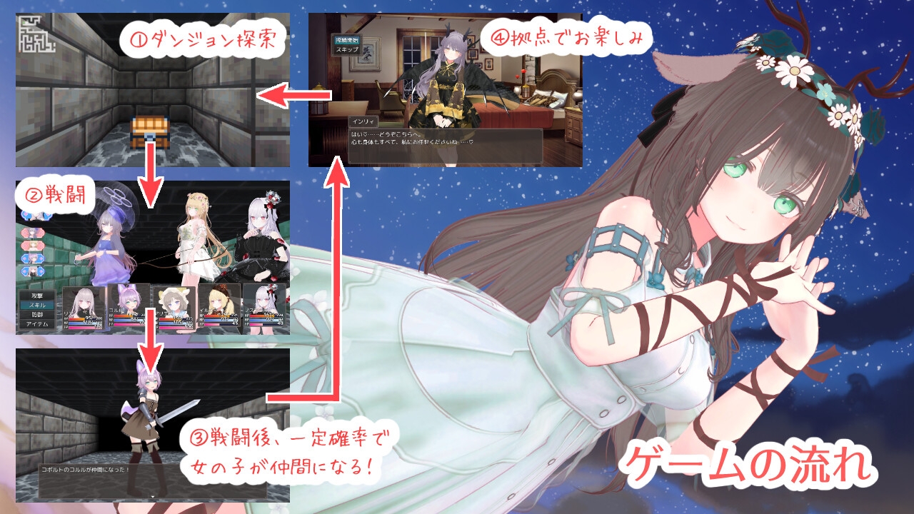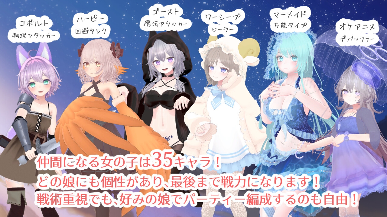 1人称視点のダンジョンRPGです。 ダンジョンで女の子モンスターと戦い、勝てば一定確率で仲間に! 拠点にもどったら仲間の女の子と各種プレイをお楽しみいただけます RPGとしてもしっかり遊べます! ・各キャラに豊富な独自スキルがあり戦闘スタイルに個性を出しています (どのキャラもちゃんと強くなるのでお気に入りの女の子で最後までプレイできます!) ・アイテム合成 ・奥義スキル ・複数パーティーで戦う討伐クエスト ・難易度選択あり ・クリア後コンテンツも満載!