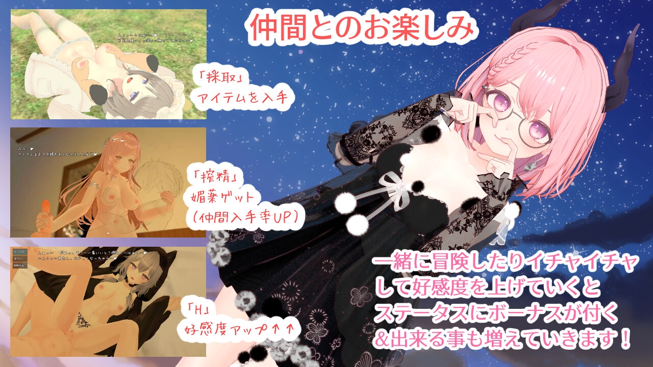 ダンジョンを攻略し、倒したモンスター娘を仲間にしよう! 自分好みのハーレムパーティーを作り昼は冒険、夜はお楽しみ! 仲間になるキャラクターは35キャラ! 全員が個性的なスキルを覚え、最後まで強くなります。 戦闘スタイルがそれぞれ異なるので外見の好みやスキルのシナジーといった自由な発想でパーティー編成を楽しめます。 エッチシーンは100シーン以上。60fpsアニメーション&フルボイスでぬるぬる動き、喘ぎます!!