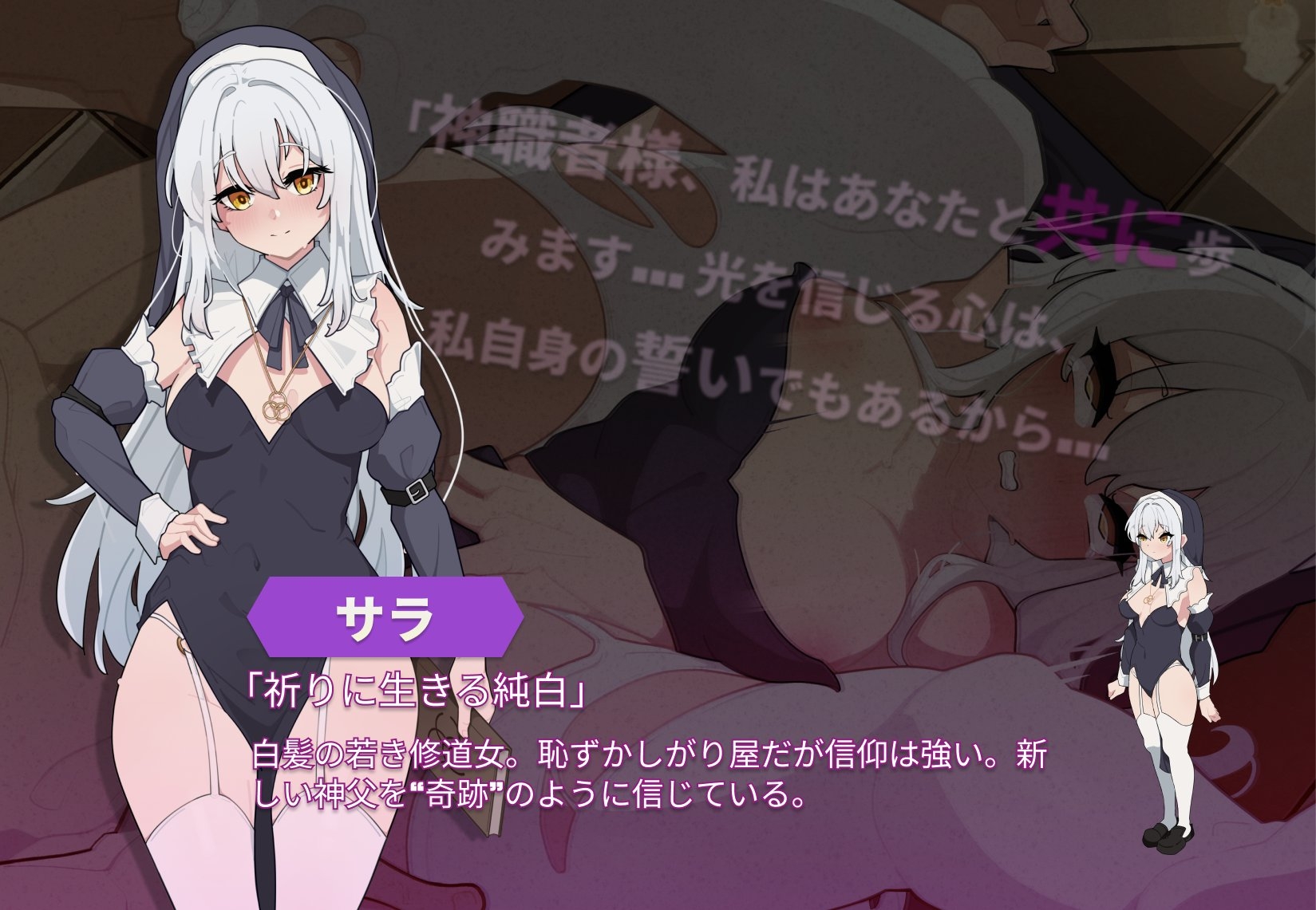 『背徳の聖職者とカクテル ―― 洗脳された祈り子たち』は、“昼と夜で立場が変わる”ことを軸にした、物語性重視のアダルトADVです。 昼:神父として信徒たちと対話し、心の隙間に入り込む時間 夜:酒場のオーナーとして客と交流し、「信仰と欲望」を操る時間