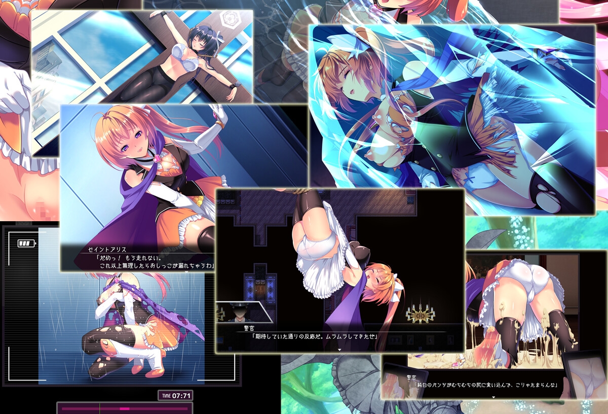 各ボスでの戦闘に敗北してしまうと、悲惨な結末がセイントアリスを待っています。無敵のセイントアリスが見るも無残な姿になる、そのギャップや転落にこだわっています。特に変身解除には特に力を入れており、ボス戦での敗北シーンのほぼ全てに変身解除を実装しています。