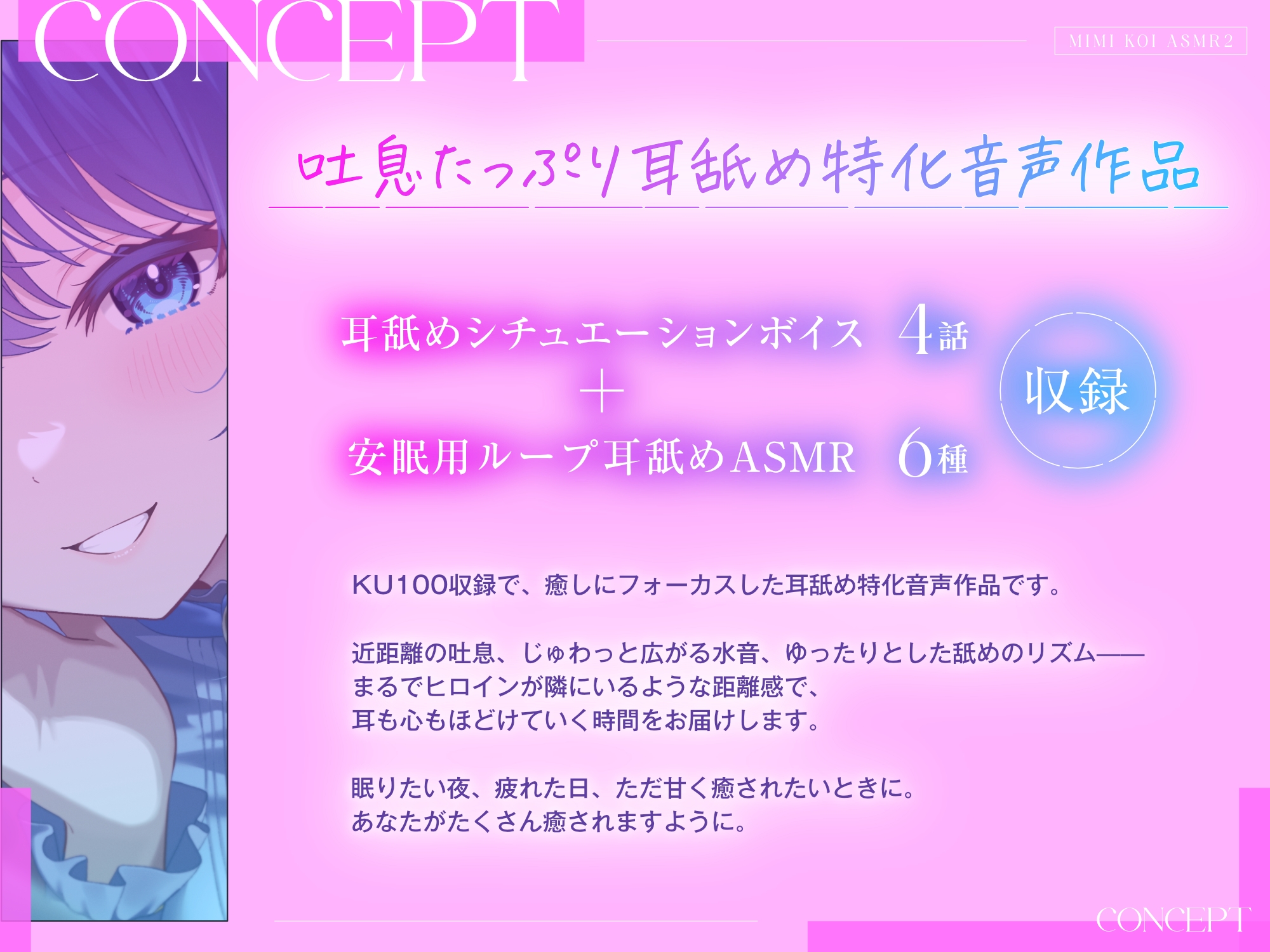 耳舐めシチュエーションボイス4話に加え、安眠用ループ耳舐めASMRを6種類収録。