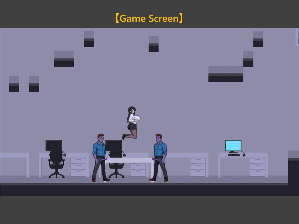 ・拘りのドットアニメーション(原地Hアクション) ・ワイシャツ・全裸の衣装差分 ・シンプルな連打脱出アクション ・短時間で遊べるコンパクトなゲーム設計