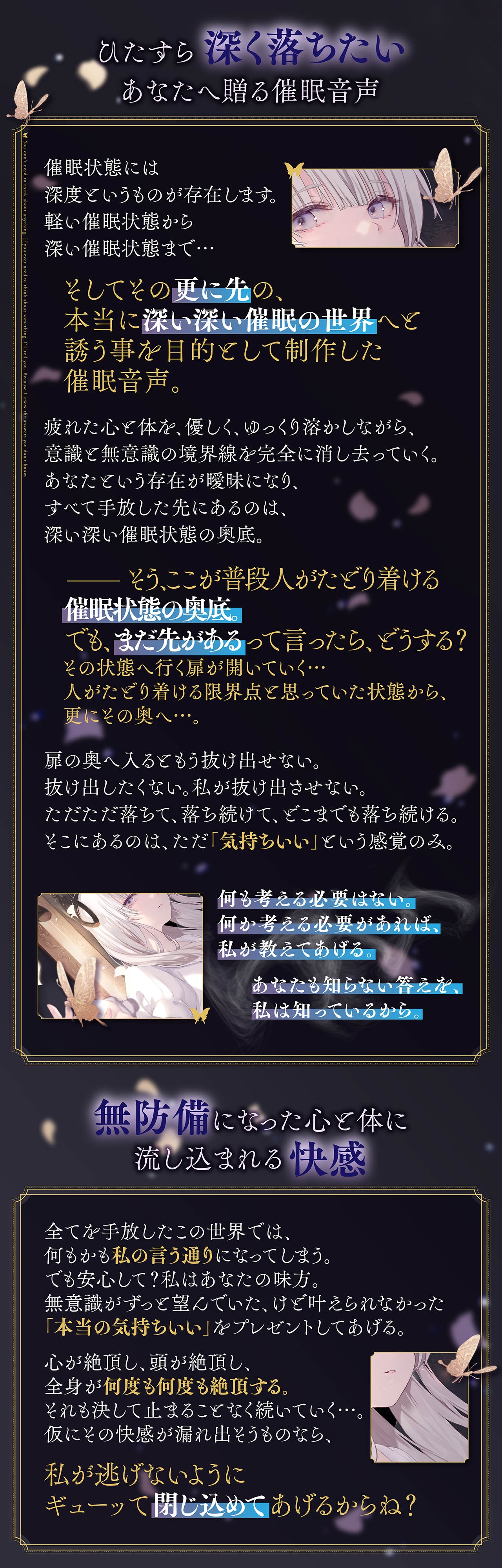 聞き手の被暗示性や、音声との相性、環境等の理由で催○にかかれない可能性があります。ご了承ください。