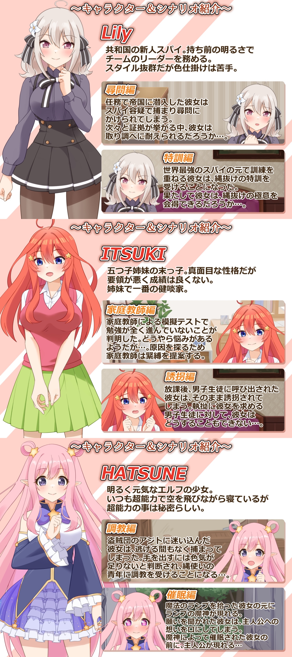 個性的な3名のキャラクターを対象に、誘拐・調教・尋問など様々な状況のシナリオで遊ぶことができます。