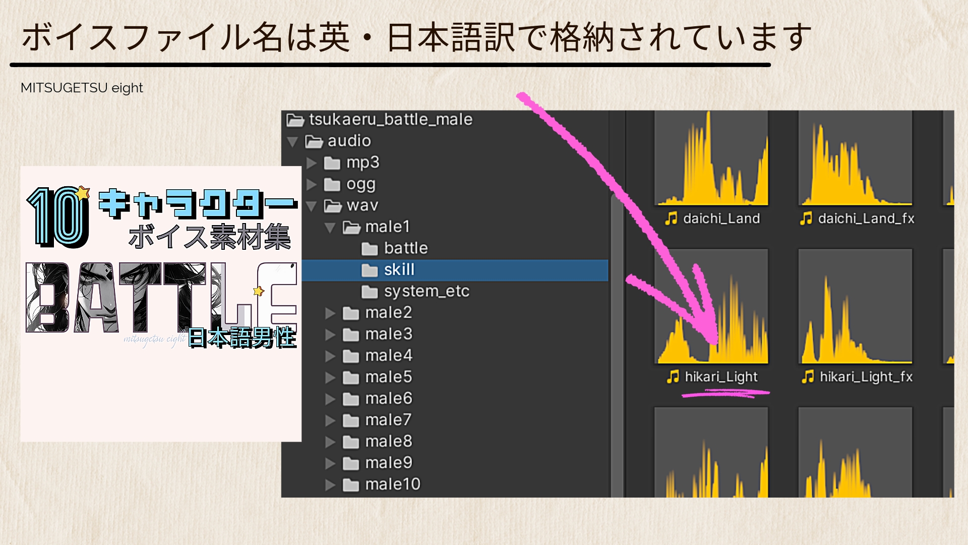 TSUKAERUシリーズはゲーム開発者が素材購入後にすぐに使える、ボイス素材であることを第一に考えて設計されています。