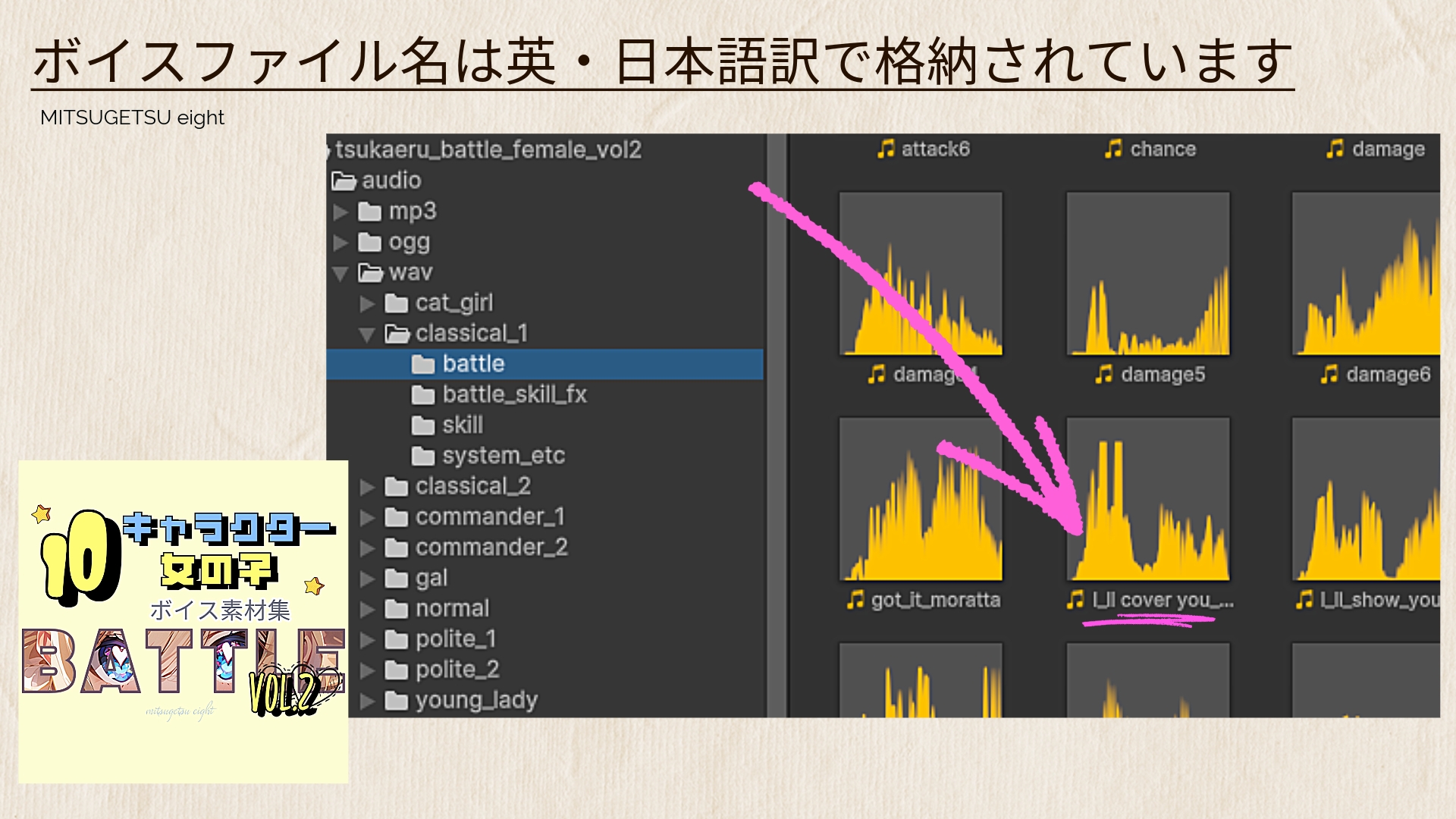 TSUKAERUシリーズはゲーム開発者が素材購入後にすぐに使える、ボイス素材であることを第一に考えて設計されています。