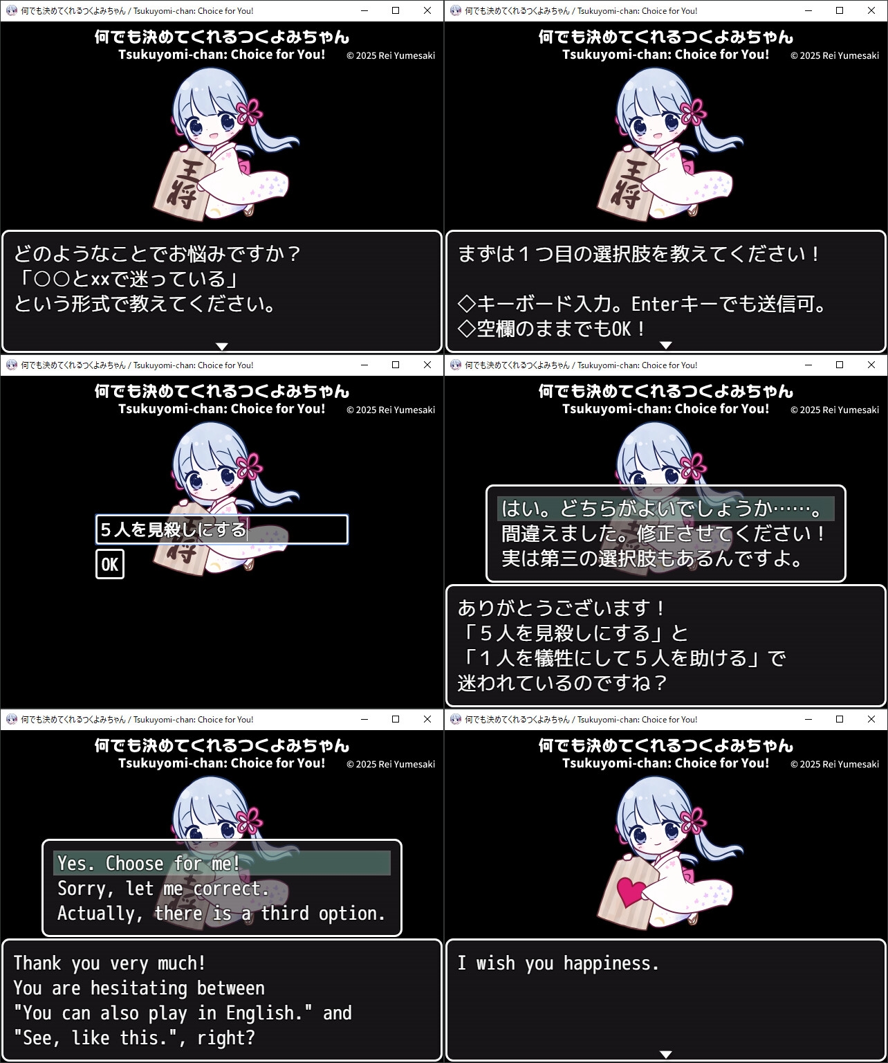 In this game, Tsukuyomi-chan chooses for you the answer from the options you enter.