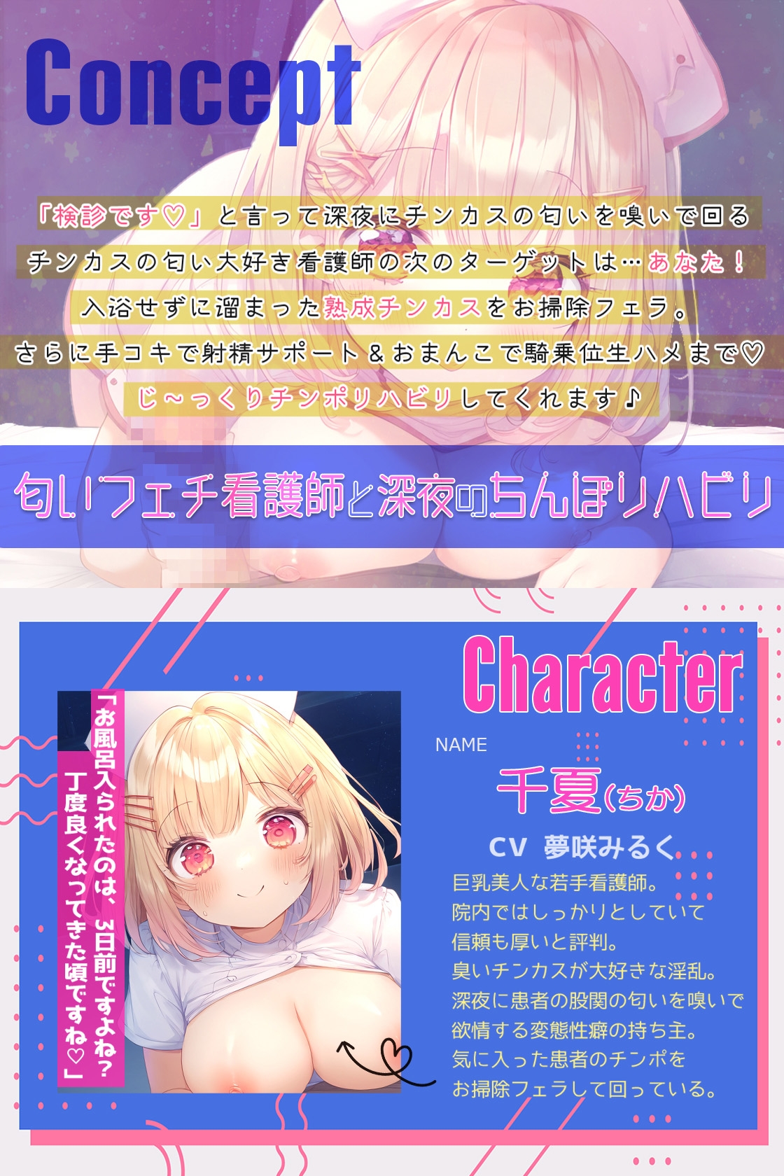 ![チンカス匂いフェチ看護師さん毎晩おちんちんの匂い嗅ぎに来て熟成チンカスを食べて!耳元囁きオナサポおちんぽリハビリ [うぃすぱあらぼ] チンカス匂いフェチ看護師さん毎晩おちんちんの匂い嗅ぎに来て熟成チンカスを食べて!耳元囁きオナサポおちんぽリハビリ [うぃすぱあらぼ]](http://img.dlsite.jp/modpub/images2/parts/RJ01412000/RJ01411685/9cc5c4907716b4b93782cdf69d377e62.jpg)